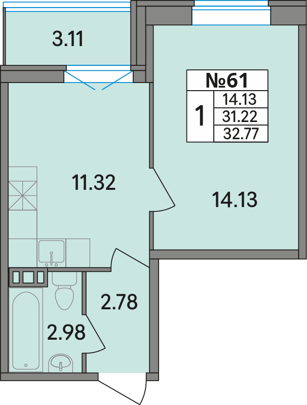 Корпус 2, Подъезд 1, Этаж 6, Квартира № 61